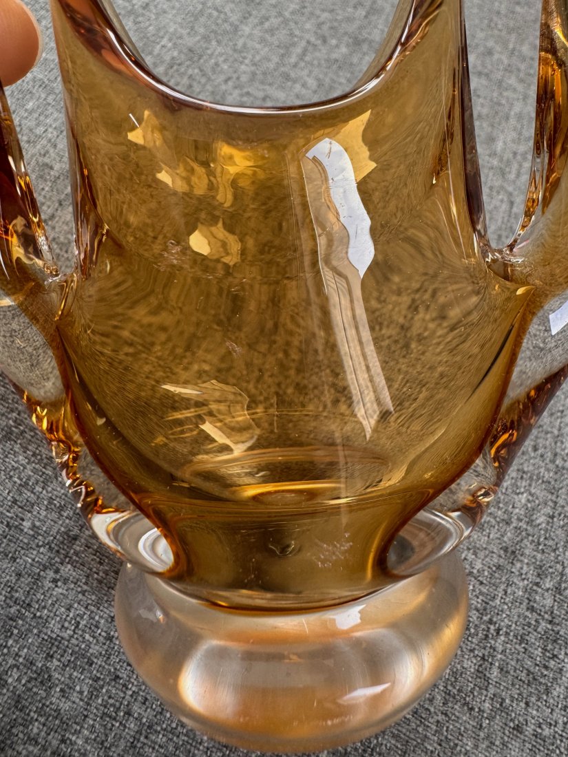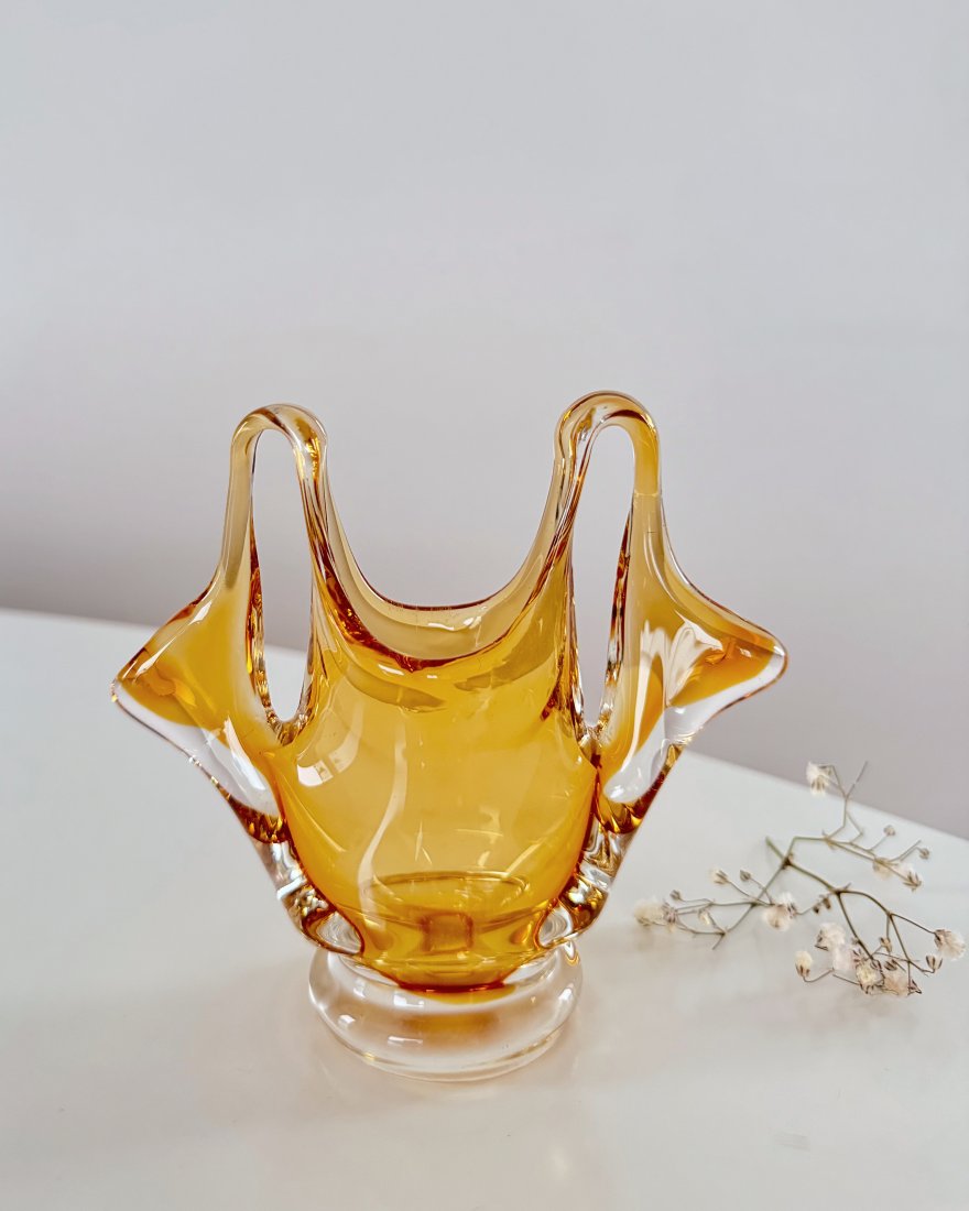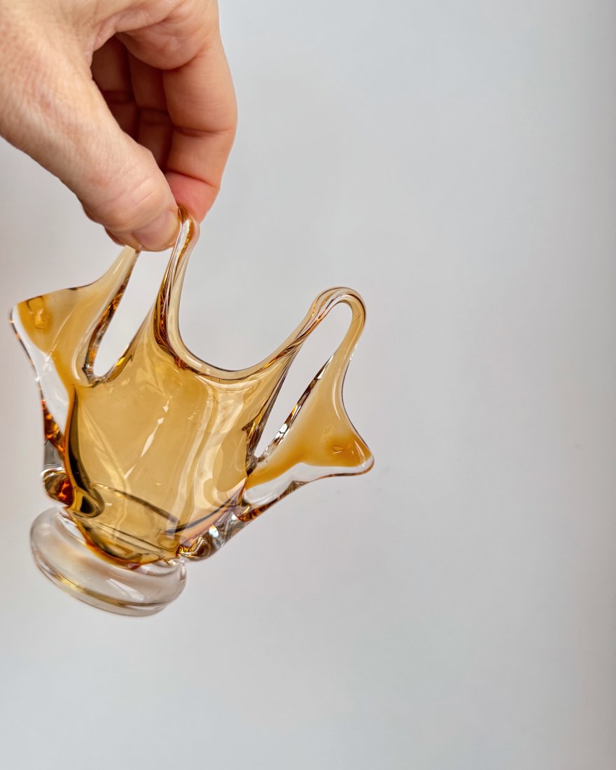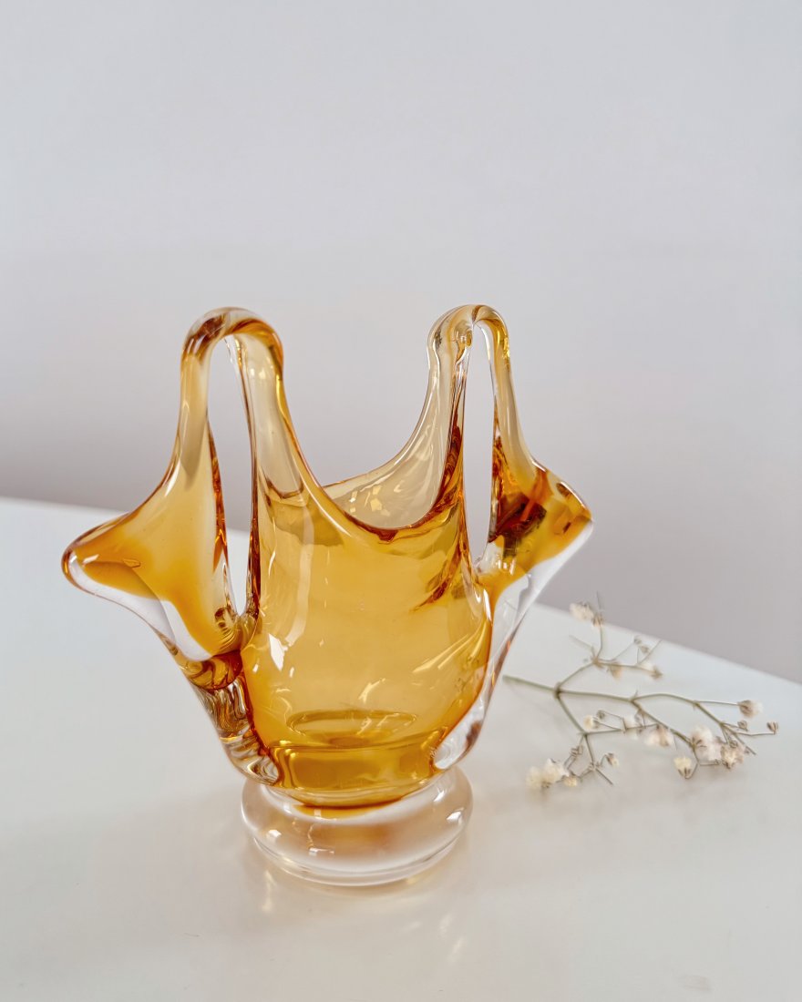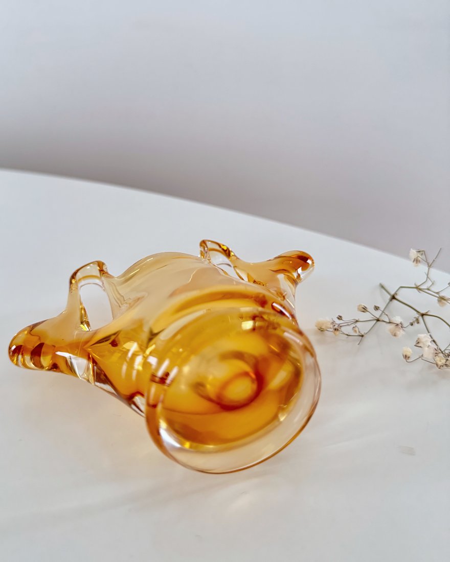 Wazonik szklany typu ‚koszyczek’, ręcznie firmowany, barwiony w masie, na kolor bursztynowy.