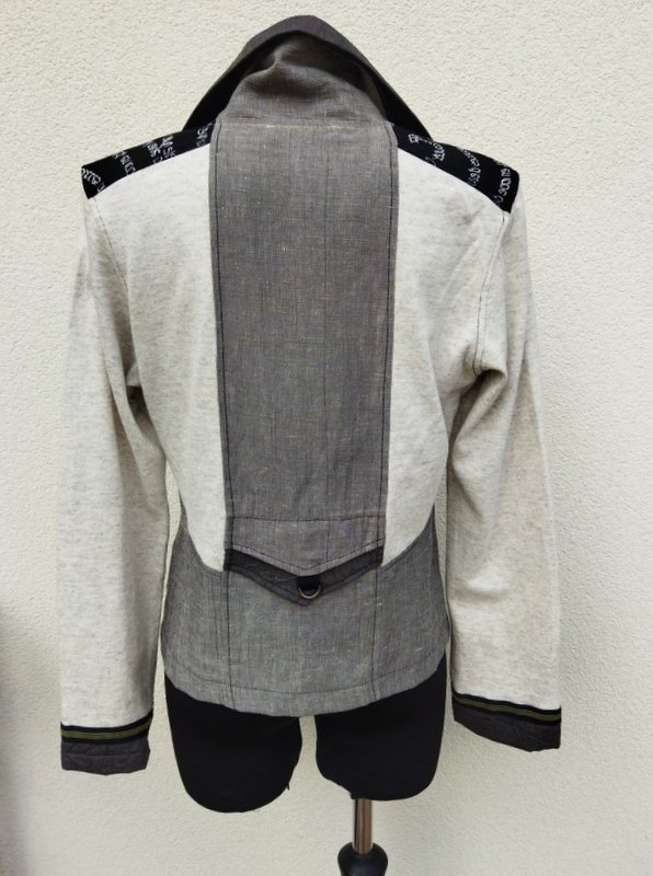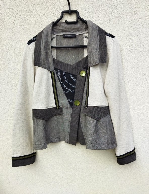 Ciekawa letnia marynarka lub kurtka z łączonych bawełnianych tkanin: dzianinowej w melanżowym jasnoszarym kolorze na pograniczu ze złamaną bielą, szarej tkaniny o płóciennym splocie, czarnej w białe wzory i brunatnej w prążki. Zdobiona taśmami. Z kołnierzem, z dwiema patkami imitującymi kieszenie, z asymetrycznym zapięciem na dwa ozdobne lśniące guziki z masy perłowej w limonkowym kolorze . Bez podszewki.