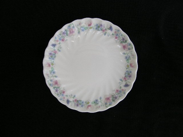 Talerzyk ze szlachetnej porcelany, sygnowany jakością Wedgwood - z kolekcjonerskiej serii Angela o pastelowym, kwiatowo-motylim zdobieniu. Ryflowany, na jedwabiście błyszcząco szkliwiony. Elegancko i na miękko kobiecy :)