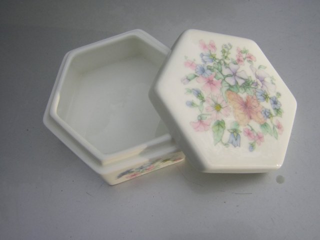 Sześciokątne PUZDRO ze szlachetnej porcelany, sygnowane jakością WEDGWOOD Bone China Made in England - z kolekcjonerskiej serii ANGELA o pastelowym, kwiatowo-motylim zdobieniu. Rzadko spotykany w tej serii kątny kształt i wyjątkowo zdobny wzór na przykrywce.. Na jedwabiście błyszcząco szkliwione. Eleganckie i kobiece.