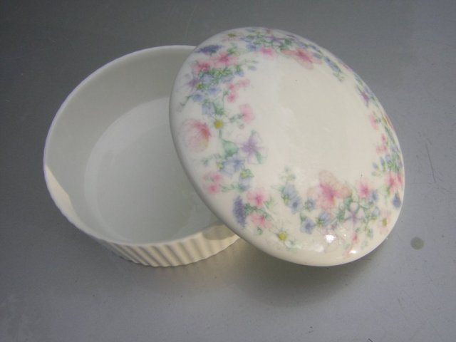 Szlachetnie porcelanowe puzderko sygnowane najwyższą jakością WEDGWOOD Bone China Made in England ; seria ANGELA? . Piękna biel błyszcząco wykończonej, dżwięczącej porcelany i urzekająca subtelność kwiatowego wzoru. Dół ryflowany.