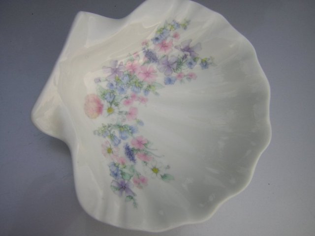 Spora Muszla - Paterka - Mydelniczka ze szlachetnej porcelany, sygnowana jakością WEDGWOOD Bone China Made in England - z kolekcjonerskiej serii ANGELA o pastelowym, kwiatowo-motylim zdobieniu. Rzadko spotykany w tej serii kształt morskiej muszli. Na jedwabiście błyszcząco szkliwiona. Eleganckia i kobiece. Na mydło, kobiece drobiazgi, orzeszki...Wielkość i kształt inspiruje do poszukiwań różnych jej zastosowań :)