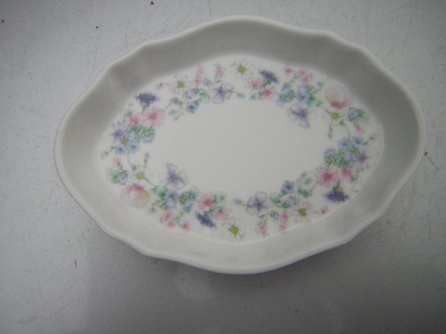 Niewielka paterka ze szlachetnej porcelany, sygnowana jakością WEDGWOOD Bone China Made in England numer 76 - z kolekcjonerskiej serii ANGELA o pastelowym, kwiatowym zdobieniu.Ciekawa forma. Ryflowania, wyższe ranty. Na jedwabiście błyszcząco szkliwiona. Elegancka i na miękko kobieca rzecz :)