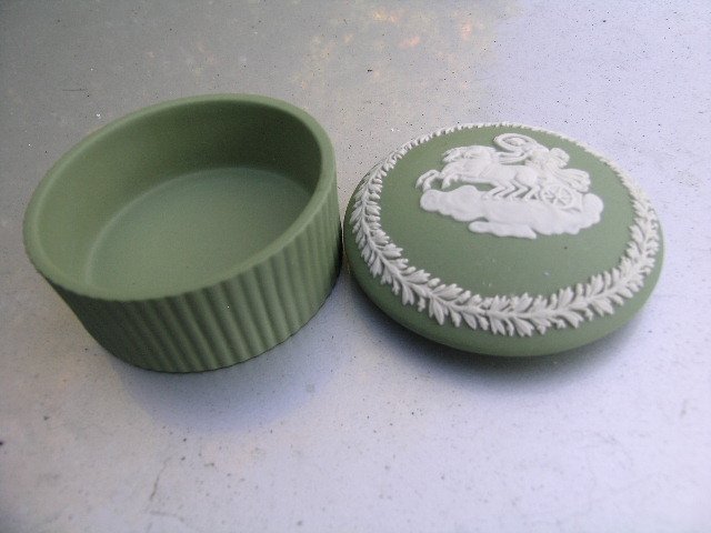 Kolekcjonerski Pojemnik - Puzderko sygnowany jakością porcelany Wedgwood. Seria kolekcjonerska z motywami antycznymi, tu w wersji oliwkowej zieleni. Matowy, szlachetny, elegancki.. Na bizuterię inne skarby . Ryflowane boki. Wypukłe wzory., Klasyka Wedgwooda.