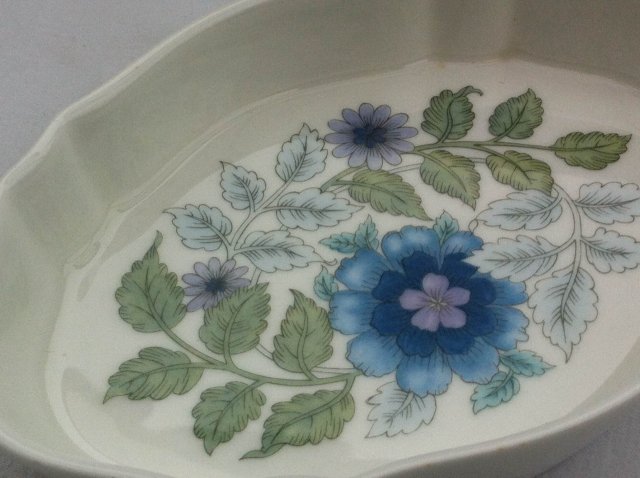 Porcelanowe naczynie w ciekawym kształcie. Sygnowane jakością WEDGWOOD, z serii CLEMENTINE. Doskonałe nie tylko do kuchni, ale i do łazienkowej aranżacji :) Ciepła biel porcelany, delikatne i precyzyjnie wykonane zdobienie... wykończenie - błyszczące. 13,5 x 9; wys. 2,5 cm. Stan zachowania bdb.