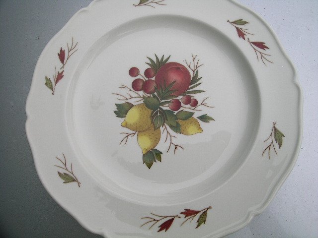 Talerz sygnowany WEDGWOOD of Etruria & Barlaston Made in England.z serii DRURY LANE. Porcelana w kolorze ecru na błyszcząco wykończona . Rant falbankowy ,ryflowany. Smakowite zdobienie w stonowanych,jesiennych barwach. Smakowity,użytkowy,ozdobny.