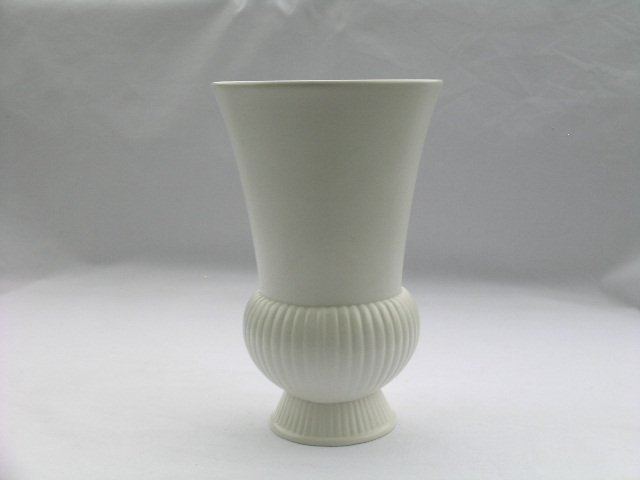 Bardzo klasyczny, bardzo powściągliwie elegancki duży wazon w ciekawej formie, sygnowany Wedgwood z dawnej, kolekcjonerskiej serii Etruria. Satynowa szlachetna porcelana w kolorze ecru i dekoracja ryflowania. Dół 7; góra 13,5; wysokość 21 cm. Stan zachowania bardzo dobry. - minus - drobna, mało widoczna wada fabryczna w postaci mikro punktu na szkliwie.