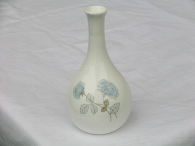Wazonik porcelanowy z kolekcjonerskiej serii od Wedgwooda z charakterystyczną, chłodną rożą. Najwyższa jakość materiału i wykonania. Sygnowany. Delikatne ryflowanie na szyjce. Błyszczące szkliwienie.