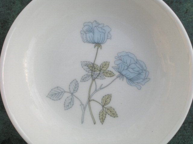 Porcelanowy spodek-talerzyk z ciekawej serii Wedgwooda z chłodną różą w błękicie. Błyszczące szkliwienie, jakość. Sygnowany. 10,5 x 2,2 cm. Stan zachowania bardzo dobry minus drobne ślady użytkowania.