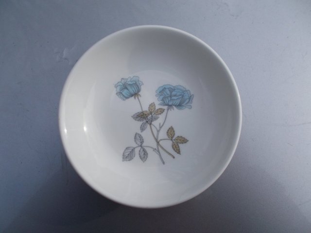 Porcelanowy spodek-talerzyk z ciekawej serii Wedgwooda z chłodną różą w błękicie. Błyszczące szkliwienie, jakość. Sygnowany. WEDGWOOD Bone China Made n England ICE ROSE.