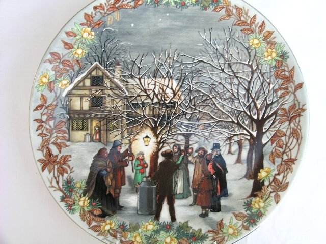 Duży talerz porcelanowy z klimatyczną, świąteczną malaturą świętowania Dwunastej Nocy, czyli 6 stycznia, gdy farmerzy zwykli chodzić do sadów, śpiewając Apple Tree. Jakość porcelany od Wedgwooda; zdobienie szlachetnie fakturowe, na błyszcząco wykończone. Z tyłu profesjonalny uchwyt do powieszenia. 23 x 3 cm. Stan zachowania bardzo dobry. Doskonały na Święta i na Świąteczny prezent :)