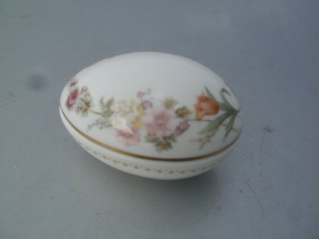 Szlachetnie porcelanowe puzderko Jajo z najwyższej jakości porcelany, sygnowane Wedgwood Bone China Made in England z kolekcjonerskiej i poszukiwanej serii Mirabelle - subtelne kwiatowe zdobienie w miękkiej kolorystyce na ciepłej bieli tła. Rant złocony. Na błyszcząco szkliwione. Eleganckie i bardzo kobiece :) Wartość kolekcjonerska :)