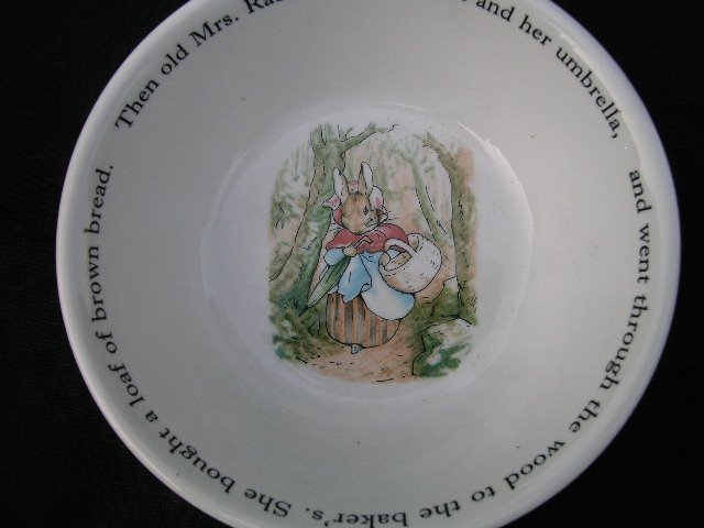 Porcelanowa miseczka na owsiankę, sygnowana Wedgwood. Z kolekcjonerskiej serii z ilustracjami Beatrix Potter i fragmentami historyjek o Króliku Piotrusiu :) Błyszczące szkliwienie i jakość wykonania. Dół 8; góra 14,5; wysokość 5 cm. Stan zachowania bardzo dobry.
