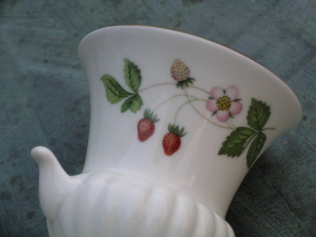 Wazonik w dawnym stylowym kształcie, sygnowany najwyższą jakością Wedgwood, z kolekcjonerskiej poziomkowej serii Wild Strawberries. Błyszczące szkliwienie, ryflowanie i złocenia. Wielce ciekawy, wielce szlachetny :) Dół 5; góra 7,2; wysokość 9 cm. Stan zachowania bardzo dobry. Ceniony, kolekcjonerski.