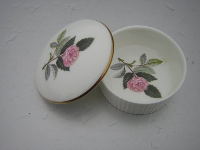 Porcelanowe, niewielkie, okrągłe puzderko . Szlachetna porcelana sygnowana jakością WEDGWOOD BONE CHINA MADE IN ENGLAND, z kolekcjonerskiej serii Hathaway Rose. Szlachetna, ciepła biel , ryflowania r i te wyjątkowe róże...wewnątrz i na górze przykrywki. Miękki kształt, złocenia i błyszczące szkliwienie.Na skarby, biżury