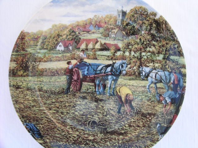 Dekoracyjny, kolekcjonerski talerz porcelanowy, sygnowany najwyższą jakością Wedgwood, z serii rocznych odsłon życia na wsi - tutaj: zbieranie ziemniaków. Sygnatura kolekcjonerska Danbury Mint. Zdobienie autorstwa Michaela Herringa. Jedwabiste szkliwienie i jakość malatury. Profesjonalny uchwyt do powieszenia.