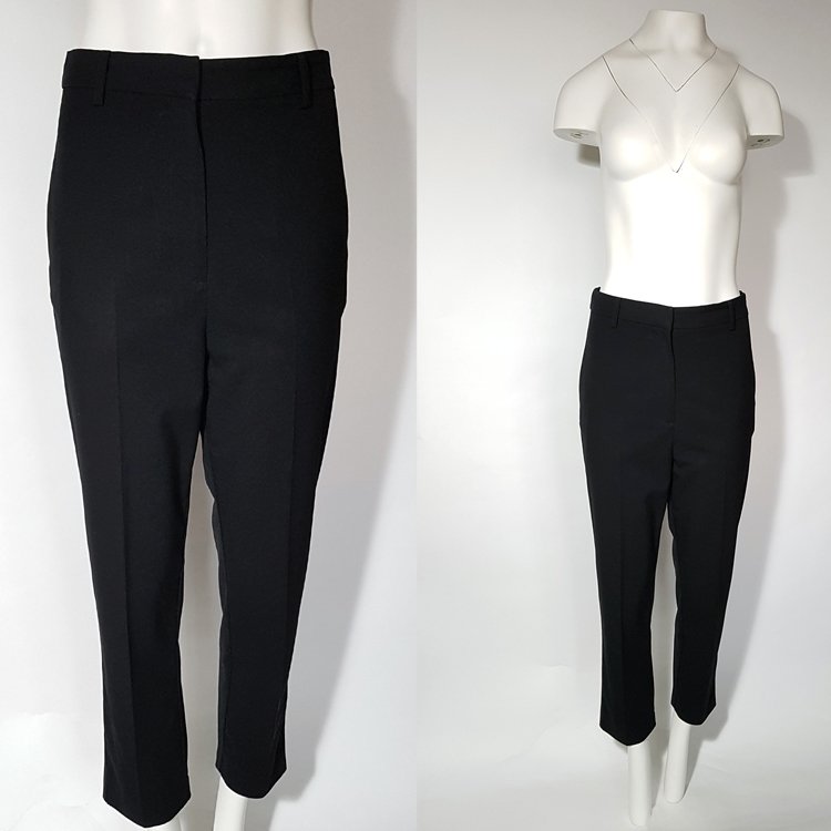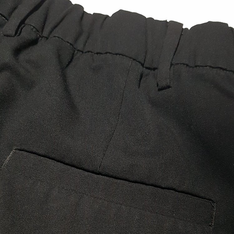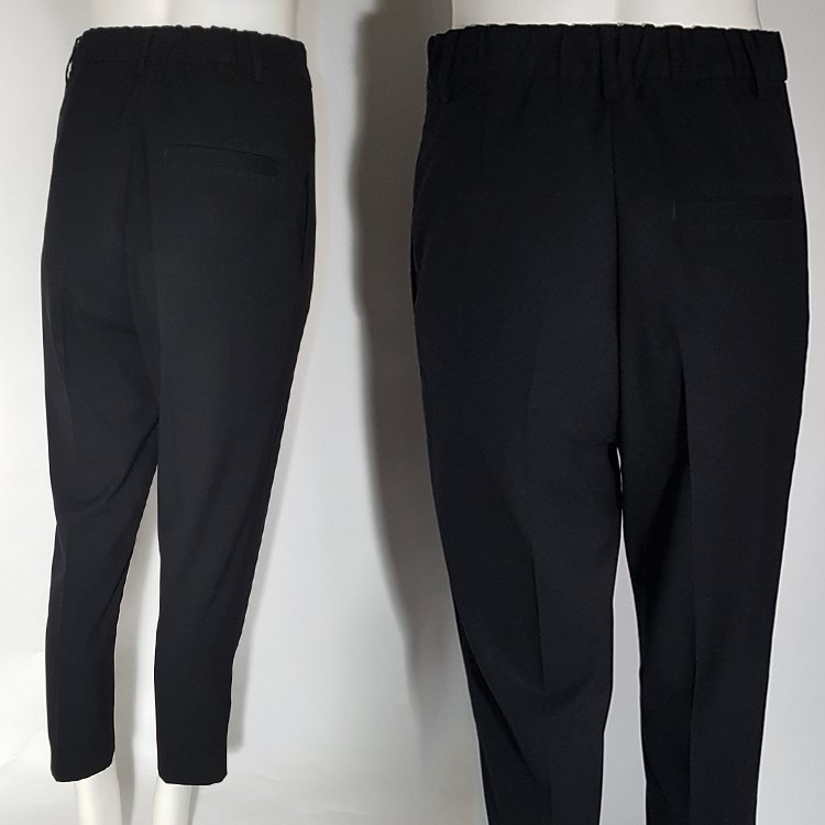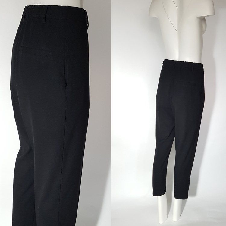 Spodnie materiałowe z wysokim stanem, zapinane z przodu na zamek, wykończone pasem z szlufkami, tył elastyczny. Nogawki długie, zaprasowane w kant, lekko zwężane do dołu, po bokach kieszenie, z tyłu atrapa kieszeni z wypustką. Spodnie łączące elegancki wygląd z komfortem, tył na gumce daje możliwość regulacji i dopasowania. Kolor czarny.