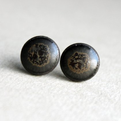 Ceramiczne okrągłe kolczyki w formie sztyftów, ręcznie wykonane z delikatnej czekoladowobrązowej gliny kamionkowej, jednostronnie szkliwione czarnych matowych szkliw z efektem plamek, na posrebrzanych sztyftach. Średnica ok. 11mm. Polecam