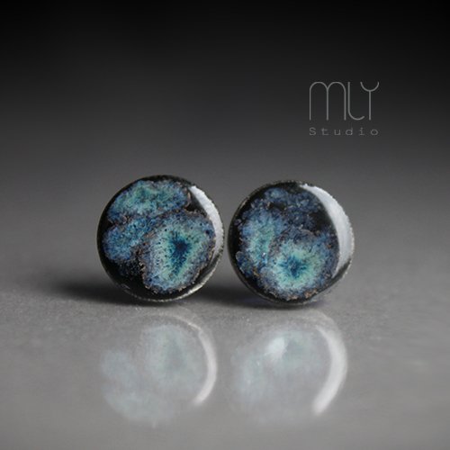 Ceramiczne okrągłe kolczyki w formie sztyftów, ręcznie wykonane z delikatnej czekoladowobrązowej gliny kamionkowej, jednostronnie szkliwione mieszanką czarnych i szarobłękitnych szkliw z efektem plamek, na antyalergicznych sztyftach w kolorze srebrnym. Średnica ok. 11mm. Polecam