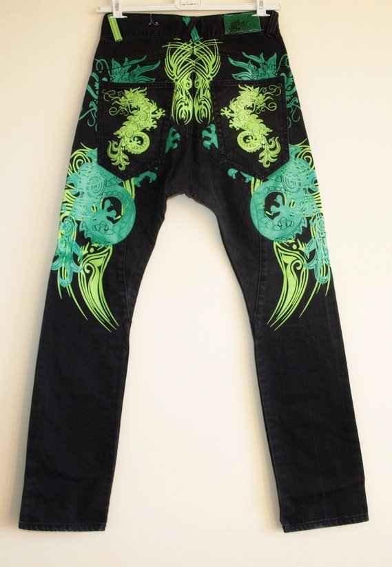 Spodnie marki Kappahl z czarnego przecieranego jeansu,w typie baggy, z obniżonym krokiem. 100% bawełna. Tył wyklejony zielonymi smokami. Stan bardzo dobry. Podany tylko rozmiar 170. Proszę sprawdzić wymiary mierzone na płasko;
