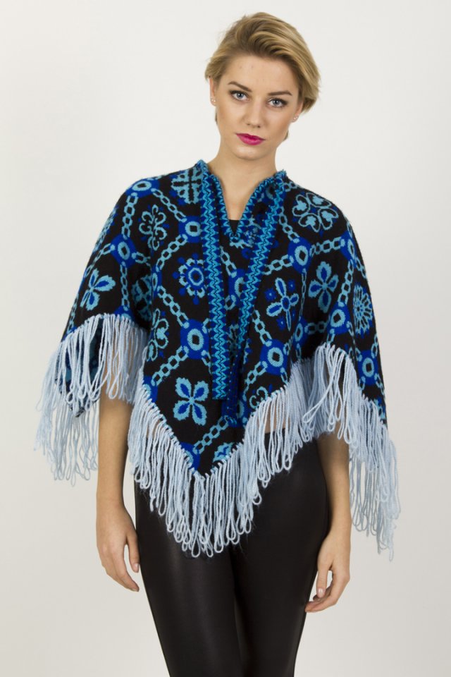 Dwustronne ciepłe ponczo w etniczne norweskie wzory, zakończone frędzlami.