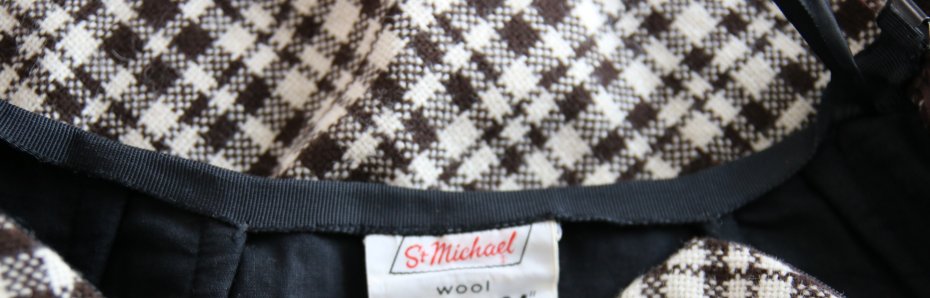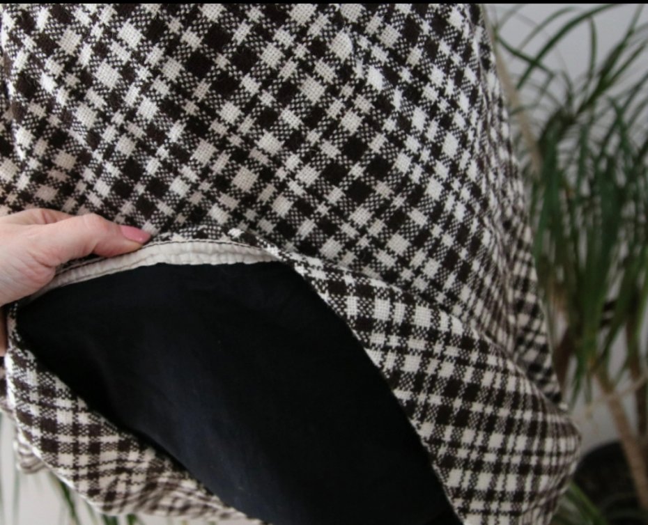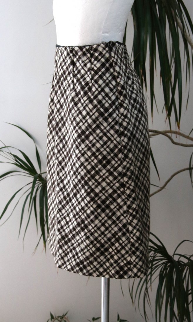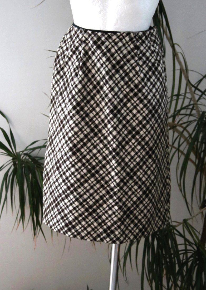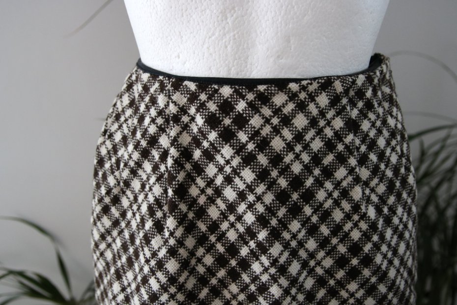 wełniana spódnica w kratkę, kolor ciemna czekolada z białym, w pasie zaszewki,