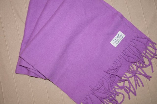 Uroczy szalik w kolorze wrzosowym marki ELGIN (made in Scotland), mięsisty, miękki, nie gryzący, bardzo twarzowy kolor, brzegi wykończone frędzelkami