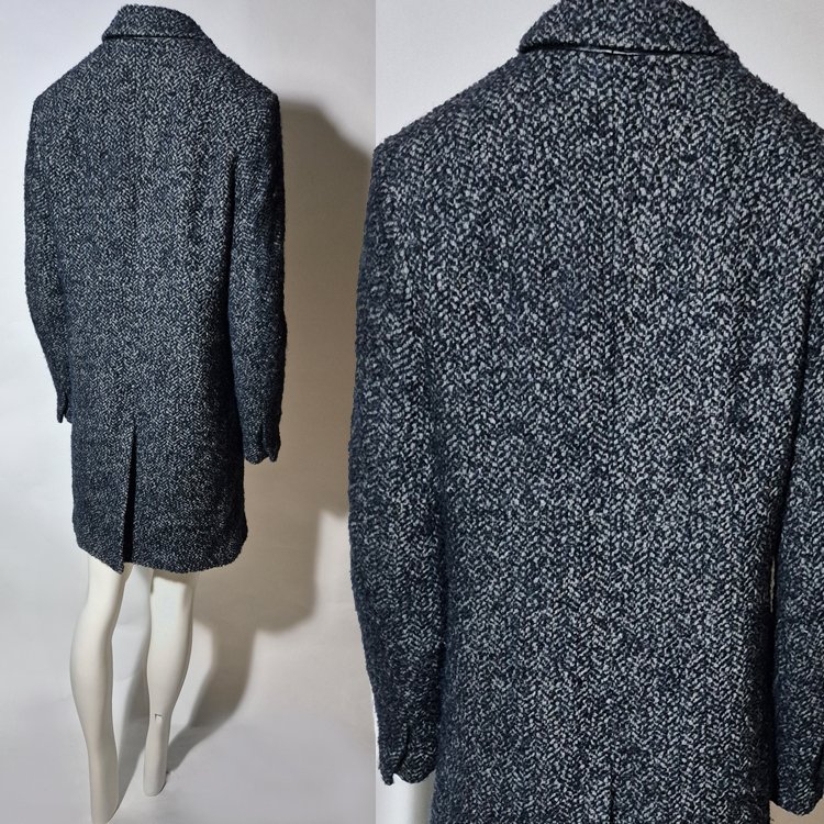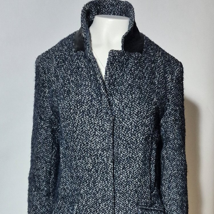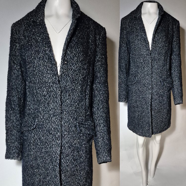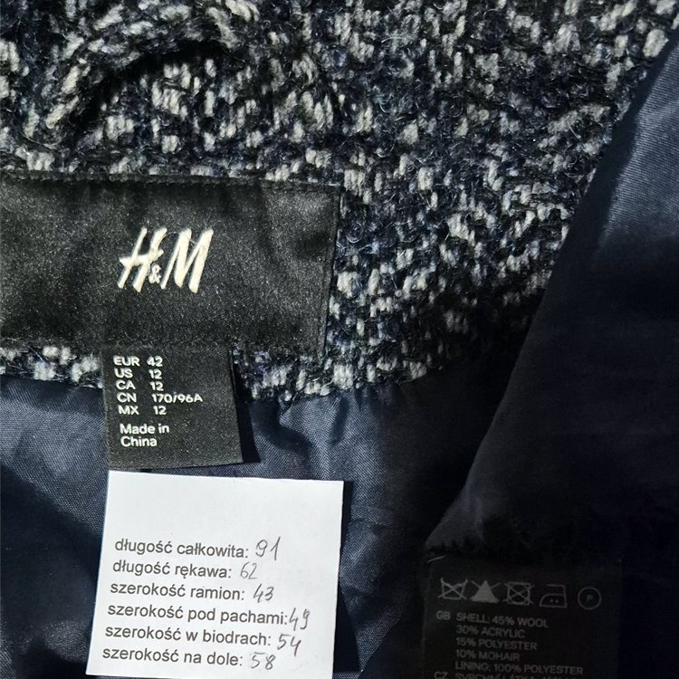 Elegancki płaszcz marki H&M wykonany z tkaniny bucle z przewagą wełny i moheru. Melanżowa tkanina w jodełkę, w odcieniach ciemnego granatu, czerni i szarości. W odbiorze z daleka daje wrażenie melanżowego grafitu.