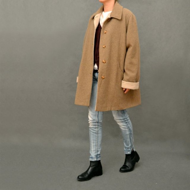Kurtka na zimną jesień. W kolorze jasnego brązu z jaśniejszymi mankietami i kołnierzem. Zapinany na guziki, po bokach kieszenie, na podszewce.