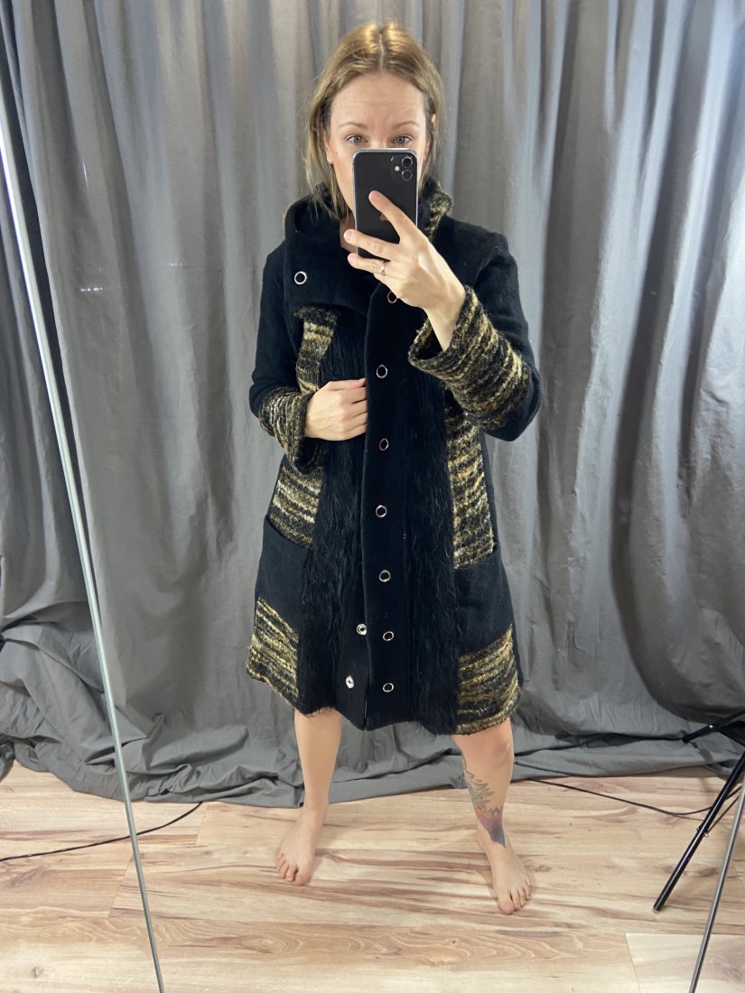 Płaszczyk na zatrzaski/kardigan marki BIRNA. Z parzonej wełny, dzianiny, moheru, patchworkowo łączone materiały.