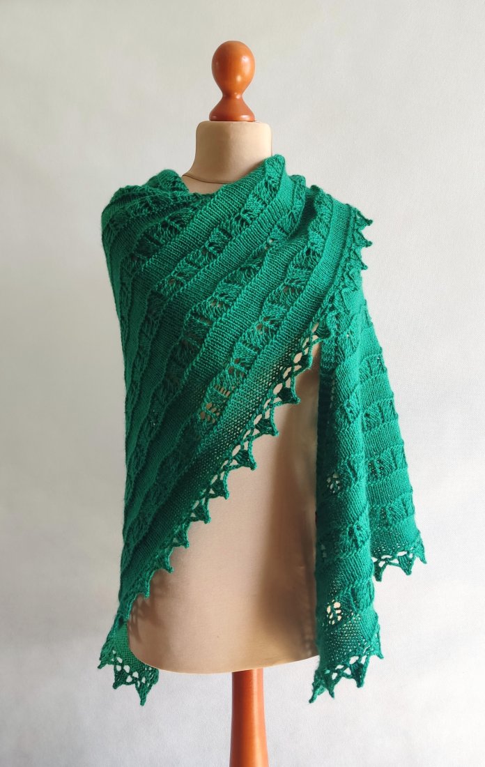 Chusta ręcznie wykonana na drutach, wykończenie szydełkowe.