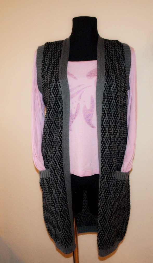 Długa dzianinowa kamizelka szwedzkiej marki, dłuższa, bez zapięcia. Materiał 30% wełna, 70% akryl. Rozmiar z metki 34, ale powinna pasować na 36. Stan bardzo dobry, prawdopodobnie nieużywana. Na manekinie o rozmiarze 38.