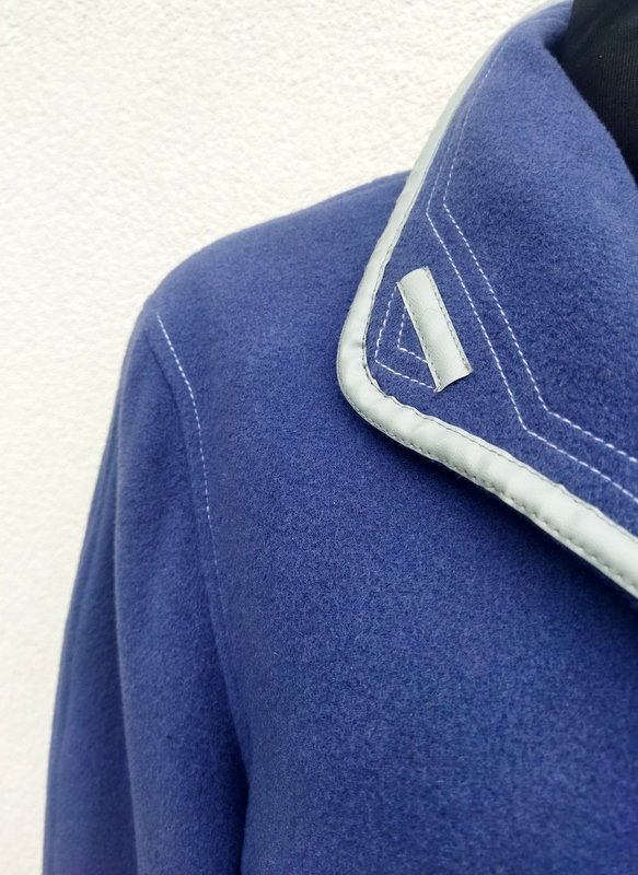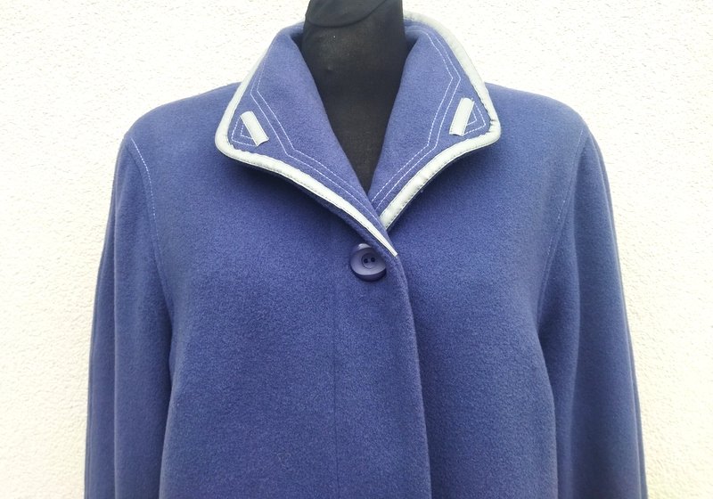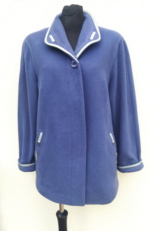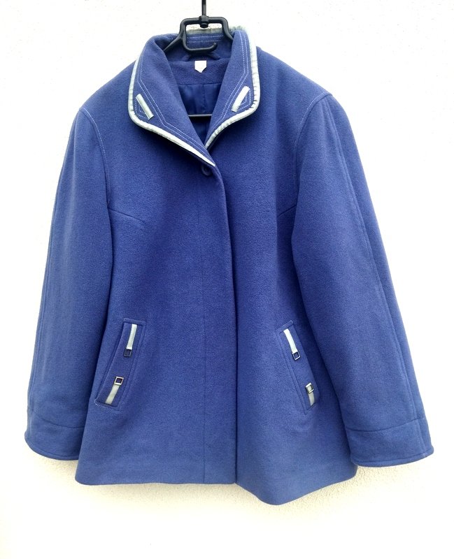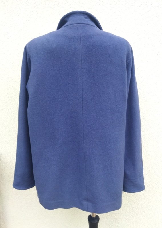 Dłuższa kurtka z flauszowej tkaniny wełnianej z domieszka poliamidu w zgaszonym niebieskim kolorze z jaśniejszymi lamówkami Z kołnierzem , z dwiema wpuszczanymi kieszeniami. zapinana na guziki ukryte pod plisą , jeden większy na zewnątrz. Całość na podszewce. Wygodna, ciepła i bardzo lekka.