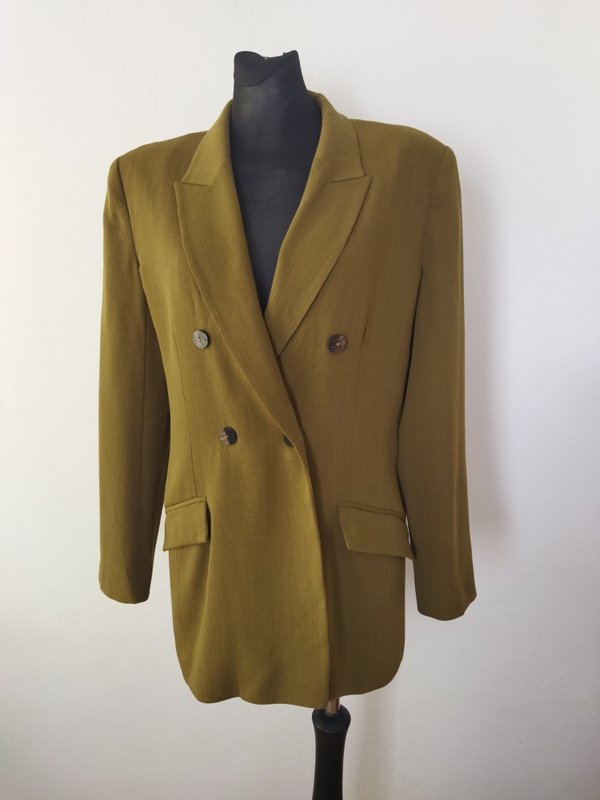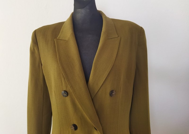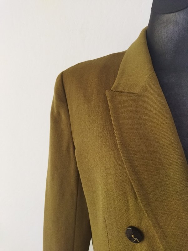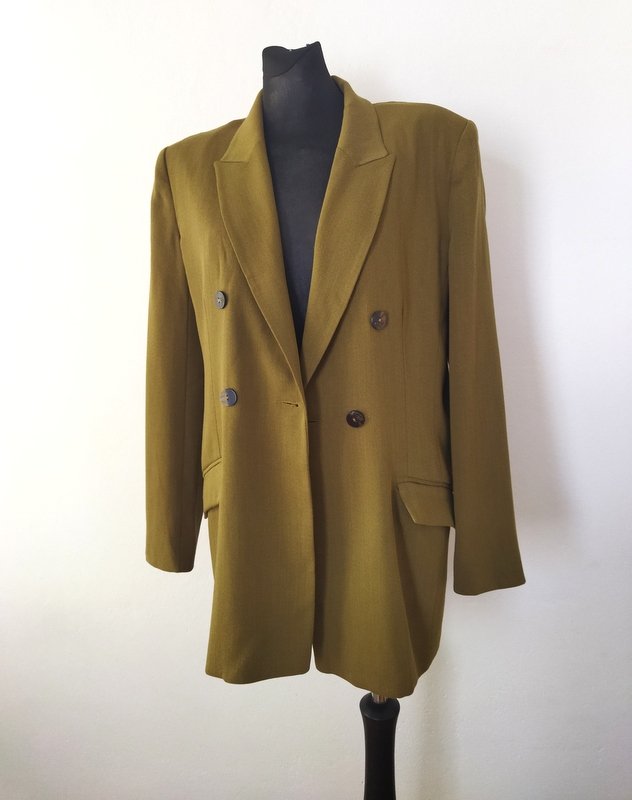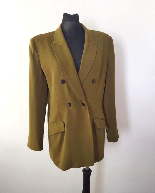 Dwurzędowa, dłuższa marynarka o dopasowanym kroju, w kolorze ciepłej zgniłej zieleni ( na zdjeciu wyszła brazowa)z wełnianej tkaniny z niewielką domieszką nylonu. Fason dopasowany, z dłuższymi wąskimi rewersami, z wpuszczanymi kieszeniami z patkami. Na podszewce.
