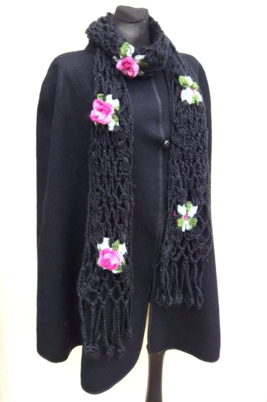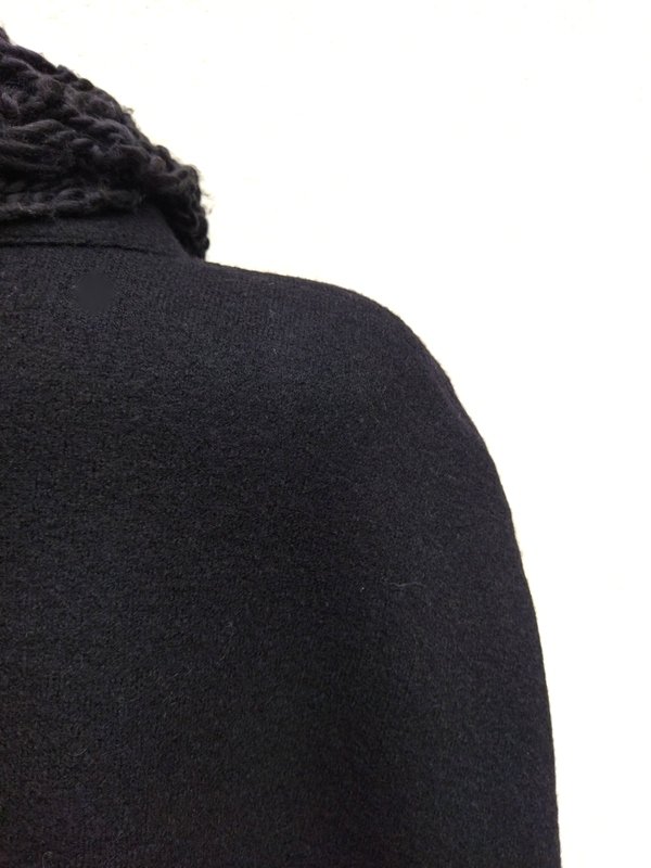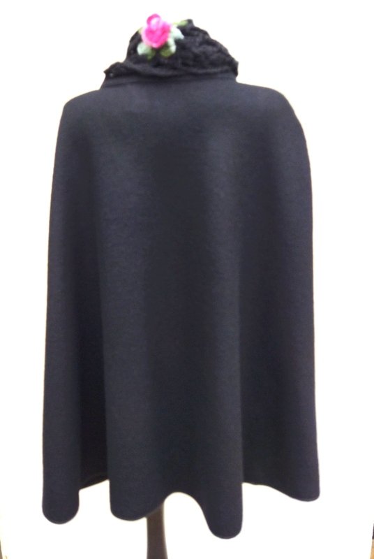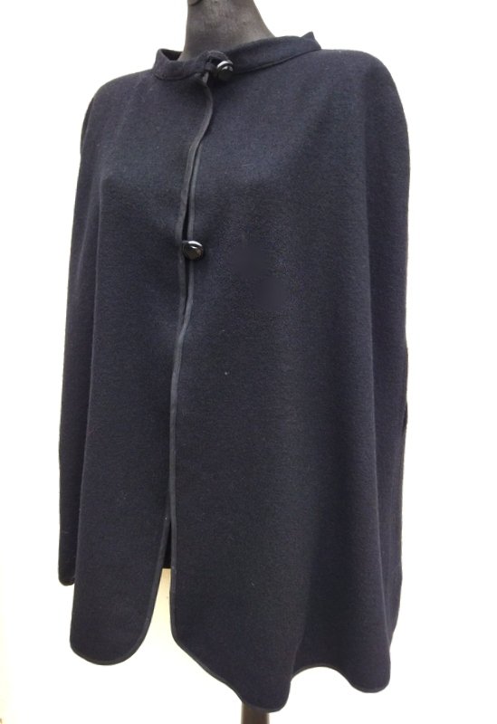 Peleryna z wełnianej tkaniny w czarnym kolorze, obszyta lamówką, Bez kołnierza, zapinana na dwa guziki. Bez podszewki.