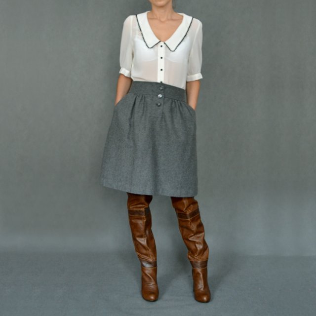 Wełniana spódnica marki JEAN PAUL. Po bokach kieszonki. Zapinana na 3 guziczki. Na podszewce.