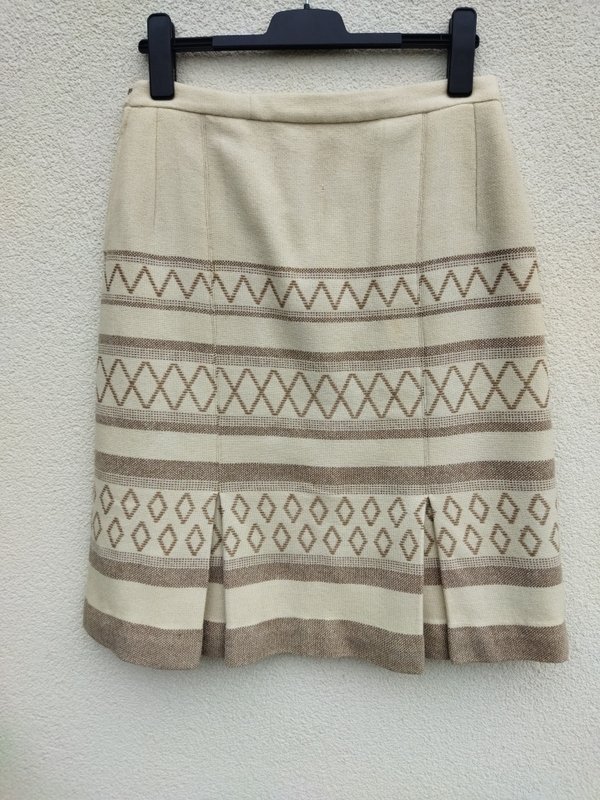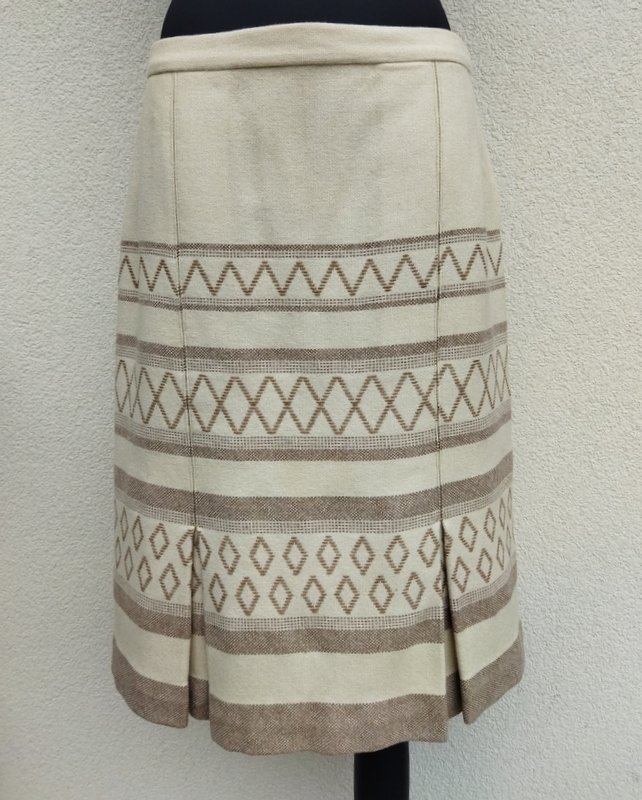 Ciepła spódnica szyta przez krawcowa z wełnianej tkaniny w kolorze ecru z wzorami w kolorze beżu. Na pasku w talii z dwiema kontrafałdami z przodu i z tyłu zaszywanymi do linii kolana, po jednej z każdego boku. Zapinana z boku na zamek - bez podszewki