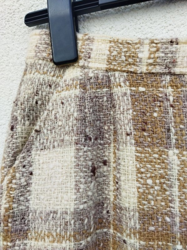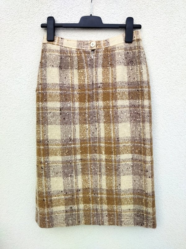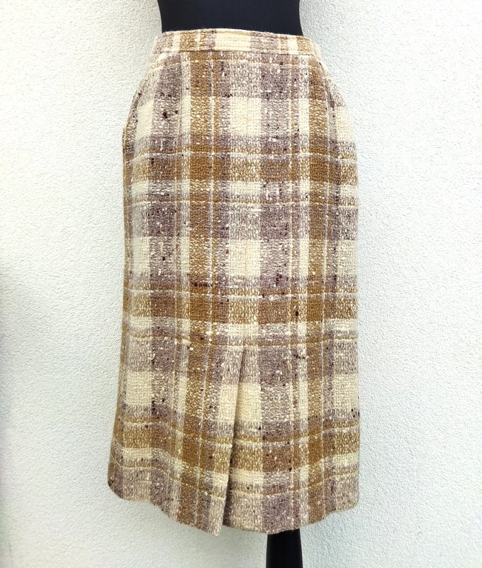 Ciepła świetnej jakości spódnica z wełnianej tkaniny z wyrazistą fakturą przeplatanki z wzorem w kratkę w kolorach ecru i dwóch odcieni beżu z tweedowymi kropkami w kolorach ecru i czekoladowego brązu. Ołówkowy fason na usztywnionym pasku w talii, z krytym rozcieciem z przodu u dołu. zapinana z tyłu na zamek i guzik. na podszewce
