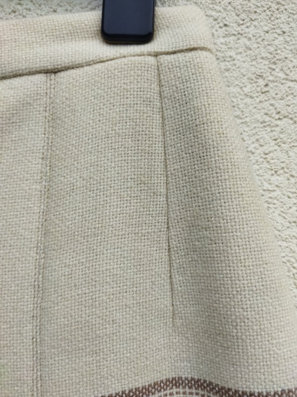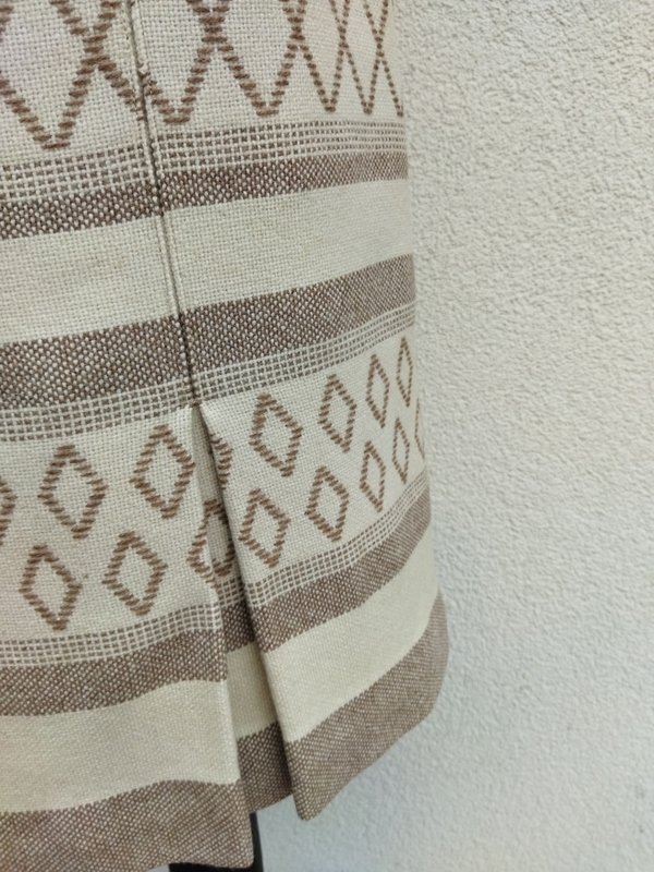 Ciepła spódnica szyta przez krawcowa z wełnianej tkaniny w kolorze ecru z wzorami w kolorze beżu. Na pasku w talii z dwiema kontrafałdami z przodu i z tyłu zaszywanymi do linii kolana, po jednej z każdego boku. Zapinana z boku na zamek - bez podszewki