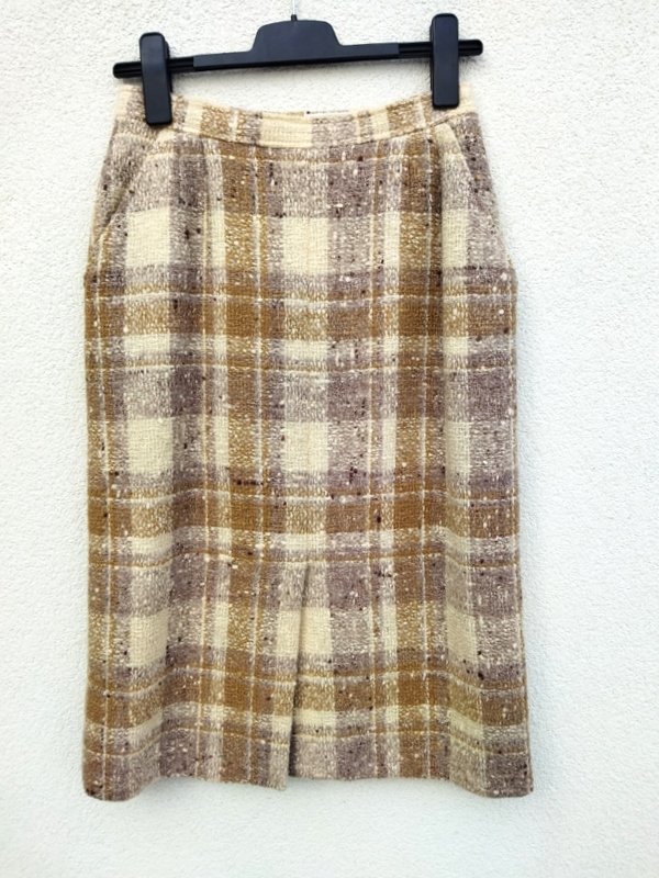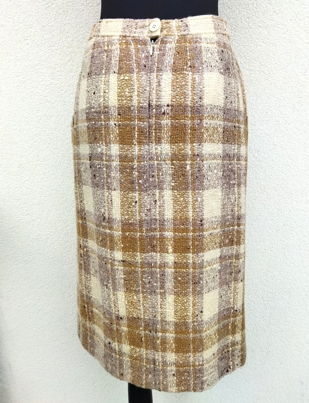 Ciepła świetnej jakości spódnica z wełnianej tkaniny z wyrazistą fakturą przeplatanki z wzorem w kratkę w kolorach ecru i dwóch odcieni beżu z tweedowymi kropkami w kolorach ecru i czekoladowego brązu. Ołówkowy fason na usztywnionym pasku w talii, z krytym rozcieciem z przodu u dołu. zapinana z tyłu na zamek i guzik. na podszewce