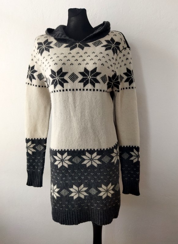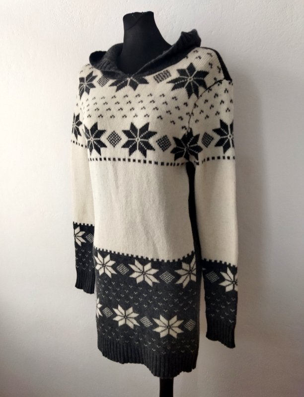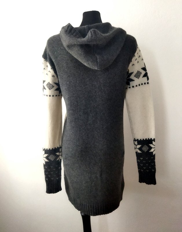 Sukienka z wełnianej włóczki z domieszka akrylu, w kolorystyce szarości i złamanej bieli , Z kapturem. Wykończona ściagaczami.