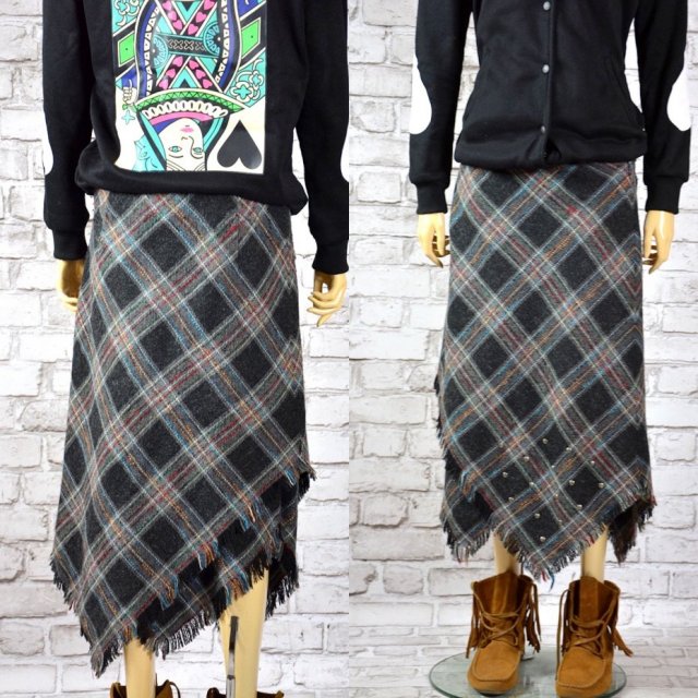 Dłuższa wełniana spódnica marki Claire D.k w odcieniach szarości w kratkę , spódnica o poszerzanym,asymetrycznym kroju, wykończona frędzami , z przodu zdobiona również nitami. Zapięcie na suwak. Całość na podszewce.