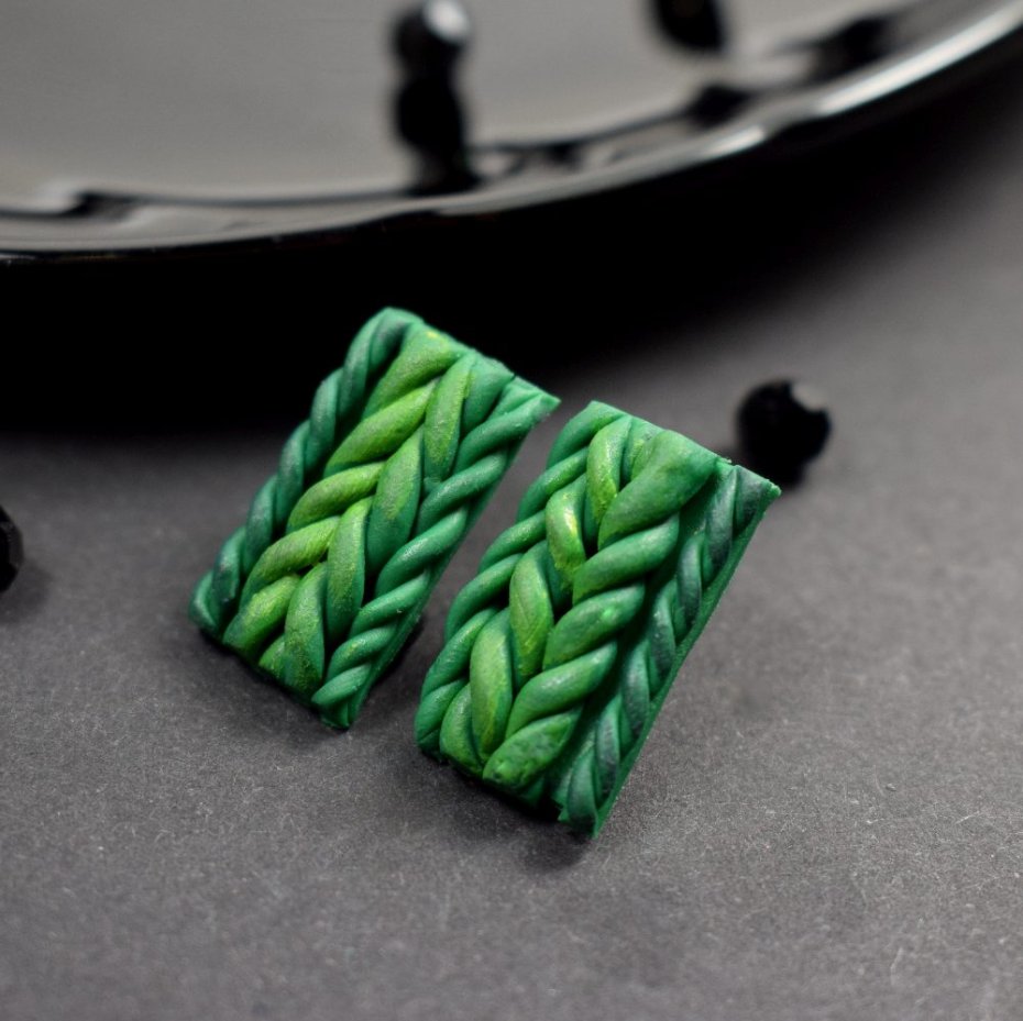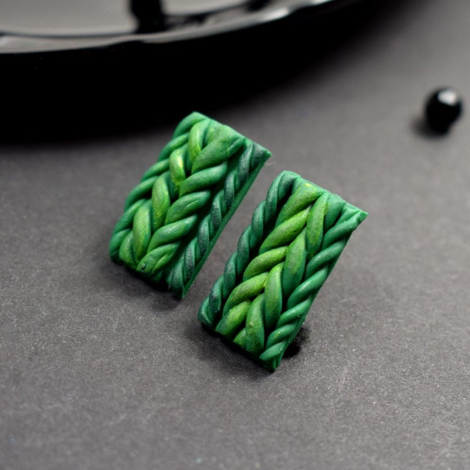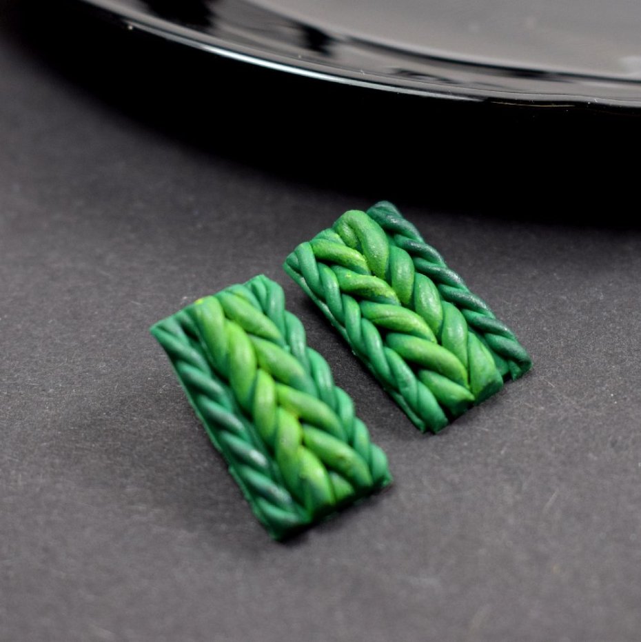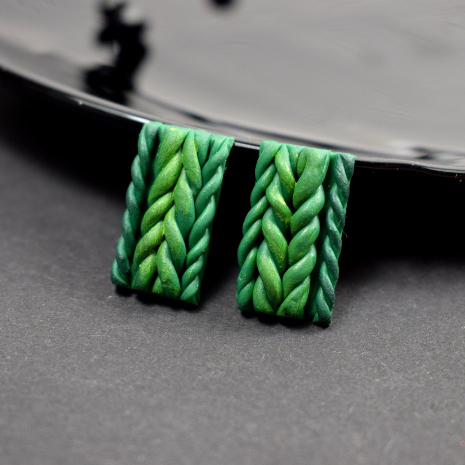 Oryginalne kolczyki w odcieniach zieleni. Ich centralny element powstał ręcznie z trwałej glinki polimerowej - lekkiej, odpornej na uszkodzenia, zachowującej trwałość i estetykę mimo upływu czasu.