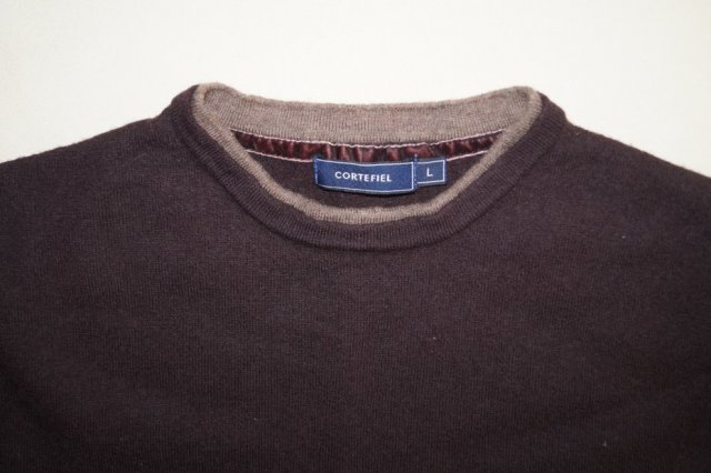 Elegancki wełniany sweterek w kolorze gorzkiej czekolady hiszpańskiej marki CORTEFIEL w rozmiarze M, bardzo dobrej jakości, mięsista dzianina wełniana, jest gęsta, miękka i nie gryzie, dekolt wykończony podwójnym ściągaczek, druga warstwa w kolorze kawowym
