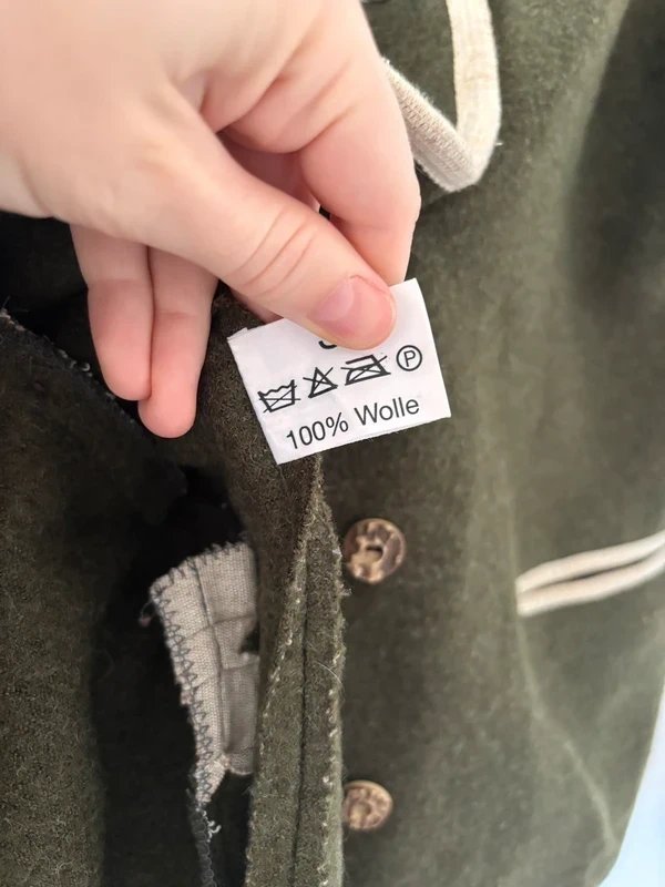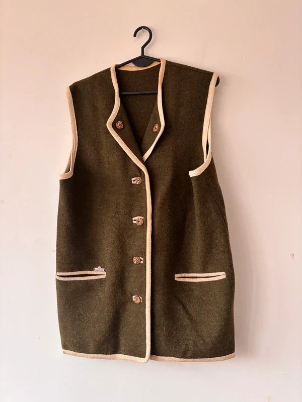 Klasyczny długi bezrękawnik wykonany w 100% z wełny (100% Wolle) od marki Wenatex Edeltextil. Model w odcieniu oliwkowym, z jasną lamówką i ozdobnymi guzikami. Ciepły, miękki i idealny do stylizacji warstwowych — świetnie wygląda z koszulą, golfem lub swetrem..
