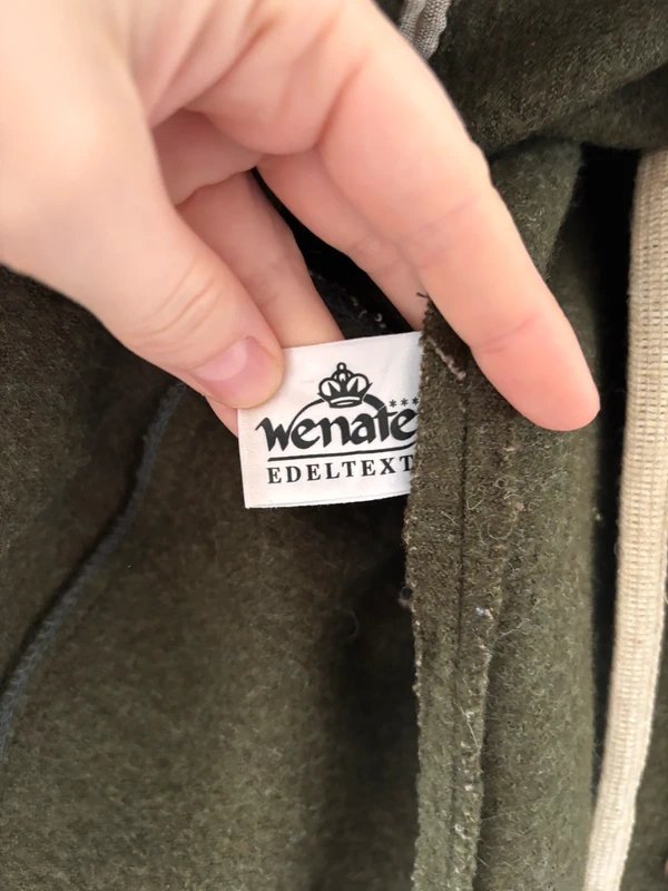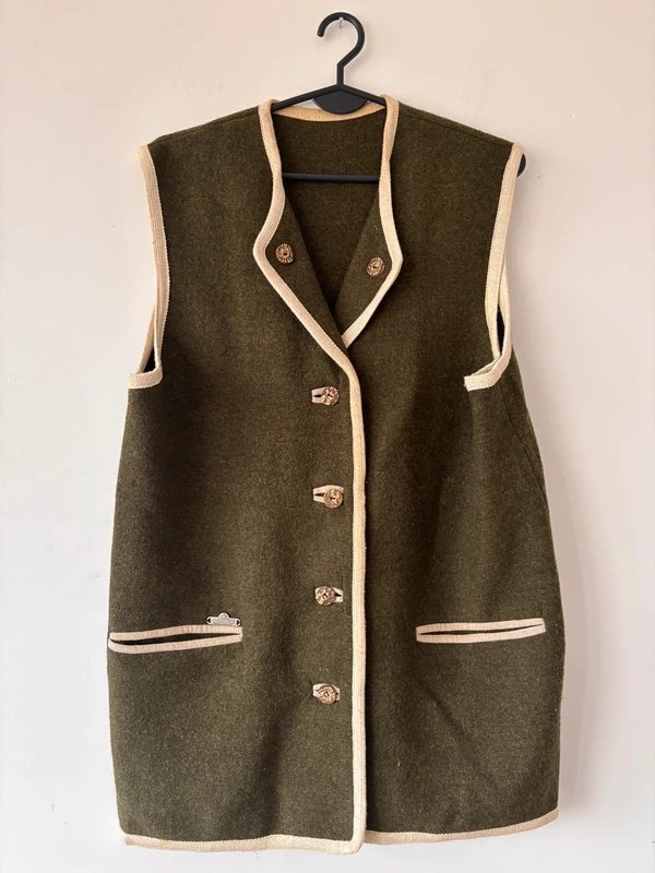 Klasyczny długi bezrękawnik wykonany w 100% z wełny (100% Wolle) od marki Wenatex Edeltextil. Model w odcieniu oliwkowym, z jasną lamówką i ozdobnymi guzikami. Ciepły, miękki i idealny do stylizacji warstwowych — świetnie wygląda z koszulą, golfem lub swetrem..