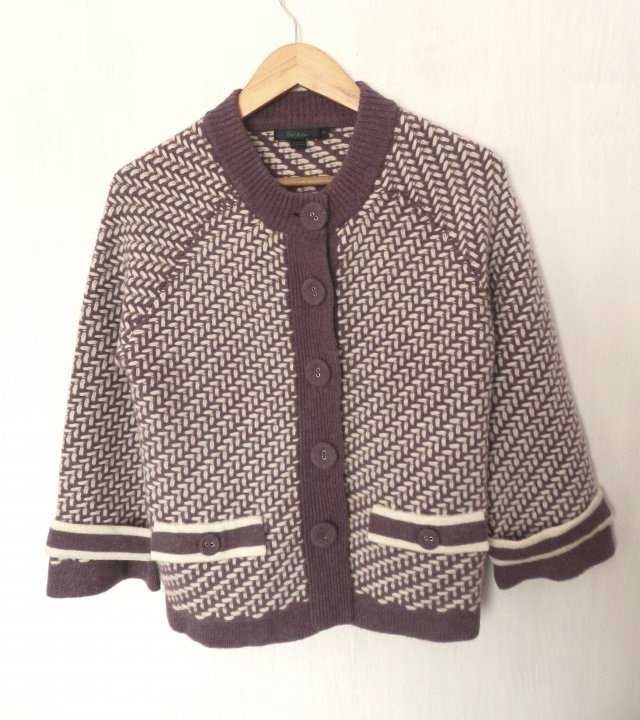 Przepiękny sweter w odcieniach bieli i jasnego fioletu zapinany na guziki z kieszonkami po bokach