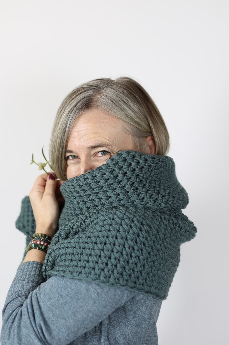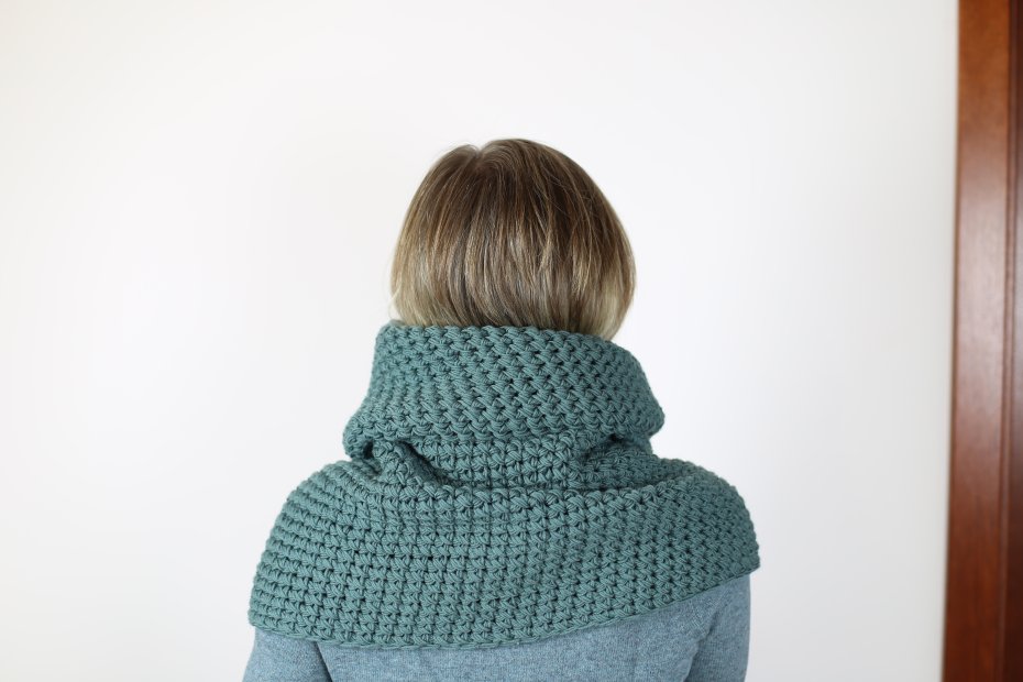 Oversizowy komin / otulacz w pięknym odcieniu przygaszonej, chłodnej zieleni, wykonany ręcznie z doskonałej jakościowo wełny, miękkiej i niegryzącej. Wyjątkowy dodatek dla wyjątkowej kobiety. Obszerny i ciepły, o specjalnym fasonie umożliwiającym różne stylizacje. Może być noszony jako ozdobny komin, kaptur albo otulacz na ramiona. Bardzo polecany przez użytkowniczki.