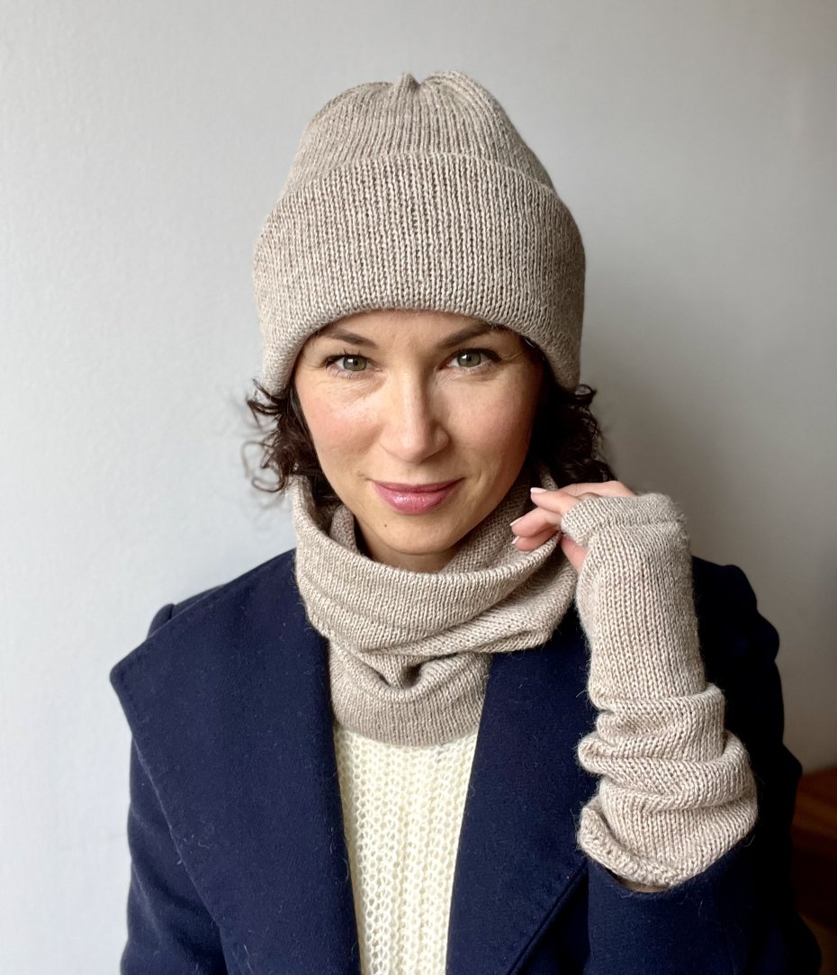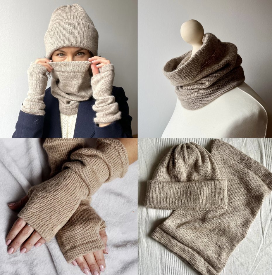 Wełniany komplet zimowy z wełny alpaki. Komplet składa się z czapki, szala typu komin oraz rękawiczek bez palców. Całość wykonana jest z 100% wełny alpaki - ekskluzywna, hypoalergiczna, delikatna (choć dla bardzo wrażliwych może troszkę gryźć).