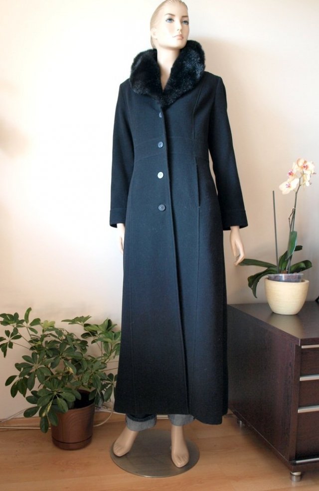Piękny długi czarny, bardzo lekki płaszcz wiosenno-jesienny marki Jacqueline de young.Materiał 70% wełna, 15% poliester 10% nylon. Kołnierz ze sztucznego futerka. Stan bardzo dobry, być może nie był używany, kieszenie zaszyte. Na dole z tyłu rozcięcie. Rozmiar z metki M, na manekinie o rozmiarze 38. Podaję wymiary mierzone na płasko;